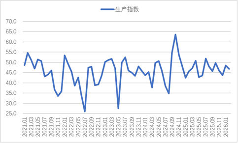 从中物联钢铁物流专业委员会调查、发布的钢铁行业 PMI 来看,2026年2月份为46.7%,环比下降3.2百分点,显示钢铁行业受春节假期因素影响,运行短期有所趋缓。分项指数变化显示,钢铁供需两端均有所收缩,产成品库存有所下降,原材料和钢材价格均弱势运行。预计3月份,随着春节影响减退以及各地政策落实,钢铁行业将稳步回升,钢铁需求逐步复苏,带动钢厂生产协同上升,原材料和产成品价格端有所上升。
