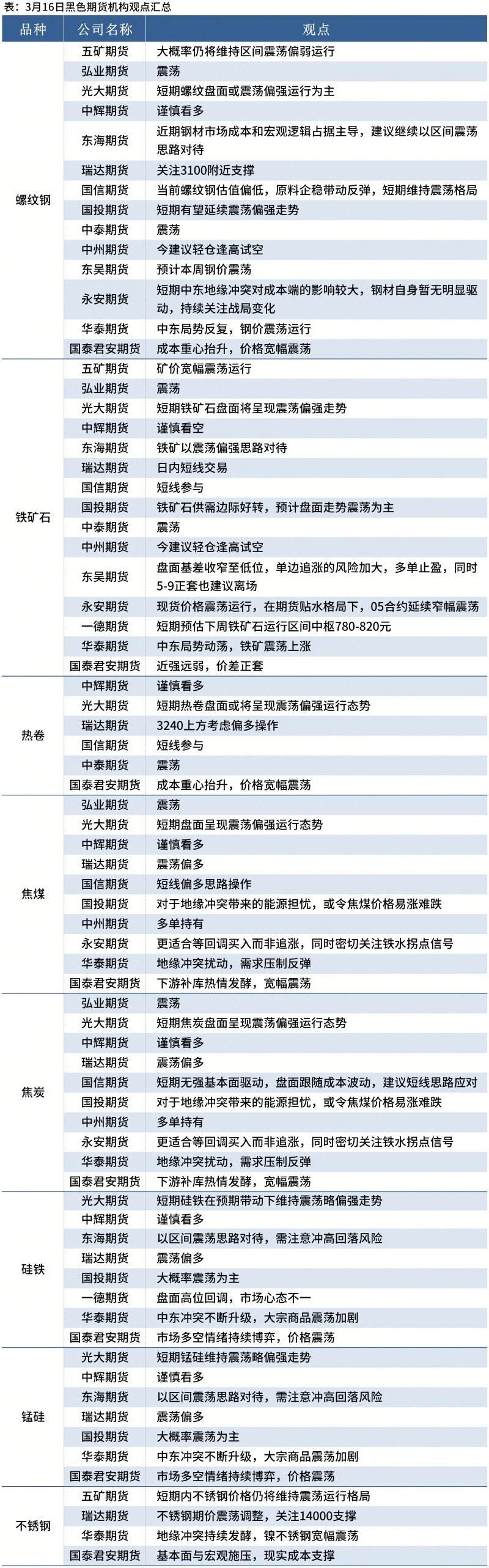 据Mysteel统计3月16日14家期货机构操作策略,其中多数机构料螺纹钢震荡运行,铁矿石震荡运行。具体汇总内容如下: