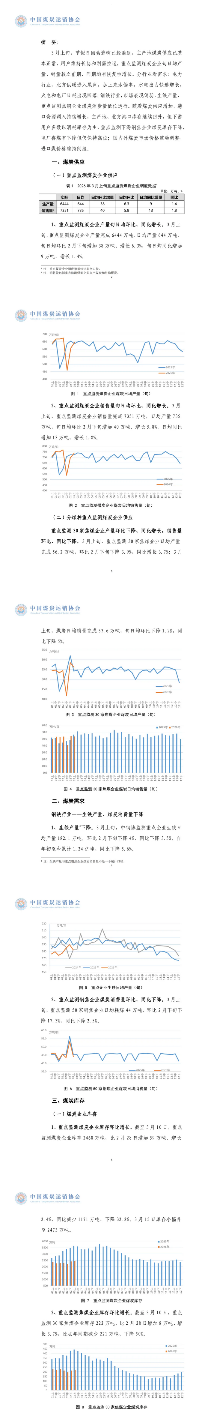 据中国煤炭运销协会消息,3月上旬,重点监测煤炭企业产量完成6444万吨,日均产量644万吨,旬日均环比2月下旬增加38万吨、增长6.3%,旬日均同比增加9万吨、增长1.4%。