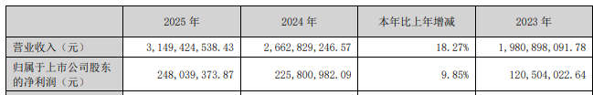 盛德鑫泰公告称,公司2025年实现营业收入31.49亿元,同比增长18.27%;归属于上市公司股东的净利润2.48亿元,同比增长9.85%。