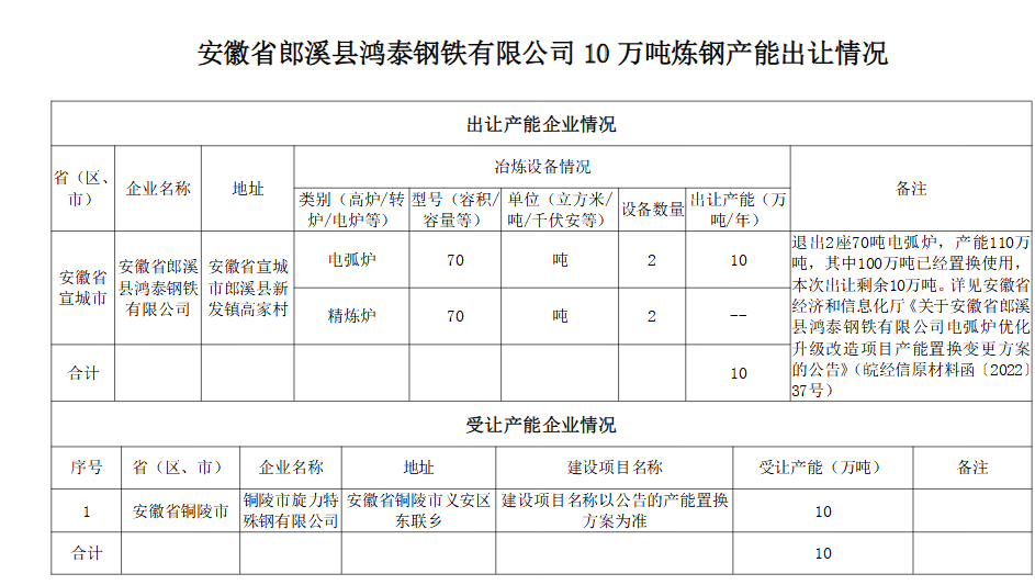 按照《国务院关于化解产能严重过剩矛盾的指导意见》《国务院关于钢铁行业化解过剩产能实现脱困发展的意见》《钢铁行业产能置换实施办法》和《安徽省经济和信息化厅关于做好钢铁行业产能置换工作的通知》要求,我局将安徽省郎溪县鸿泰钢铁有限公司10万吨炼钢产能出让情况予以公示7天,公示期间无异议。现将安徽省郎溪县鸿泰钢铁有限公司产能出让情况予以公告,欢迎社会公众进行监督。