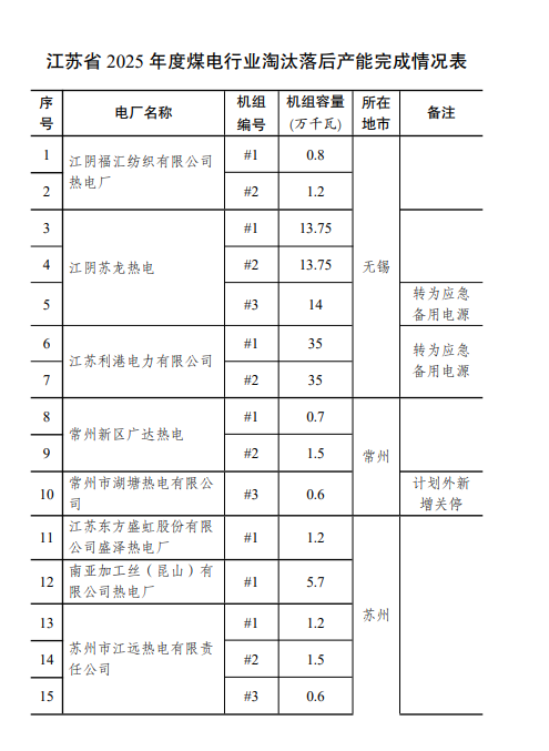 根据国家能源局《关于下达2022—2025年煤电行业先立后改淘汰落后产能目标任务(第一批)的通知》等要求,我省有序开展煤电行业淘汰落后产能工作。经各地申报,省发展改革委(省能源局)会同省电力公司等部门现场核查确认,2025年全省淘汰煤电落后产能合计221.3万千瓦,现将关停机组情况予以公布,接受社会各界监督。