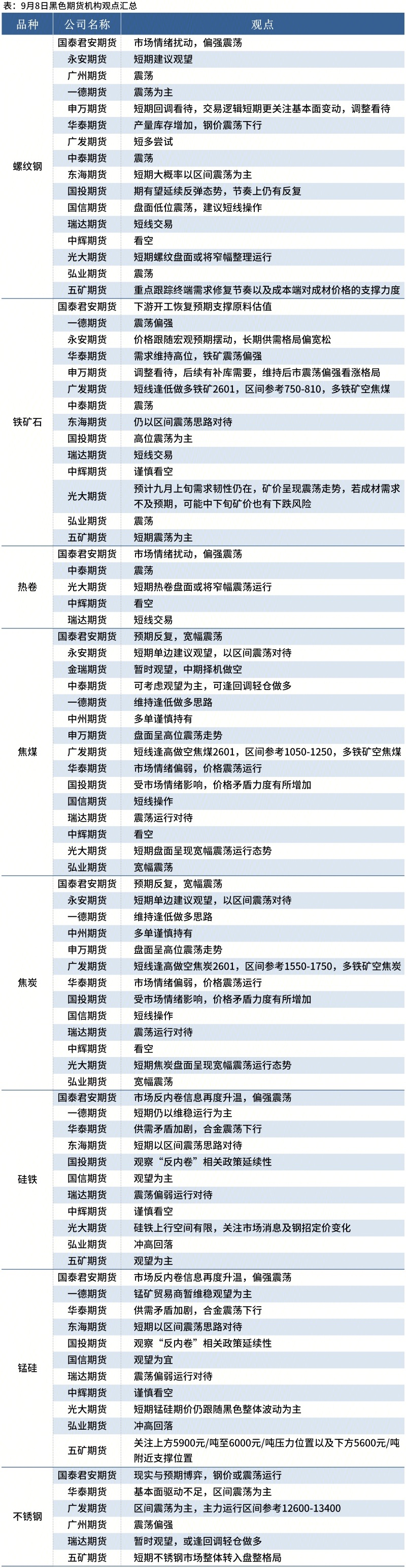 据Mysteel统计9月8日18家期货机构操作策略,其中多数机构料螺纹钢震荡运行,铁矿石震荡运行。具体汇总内容如下: