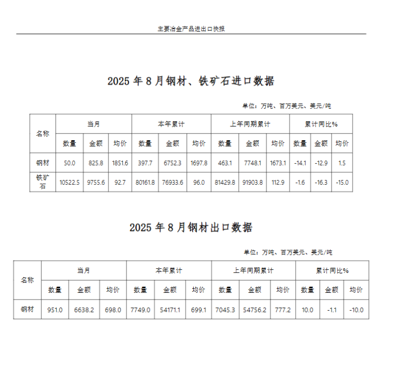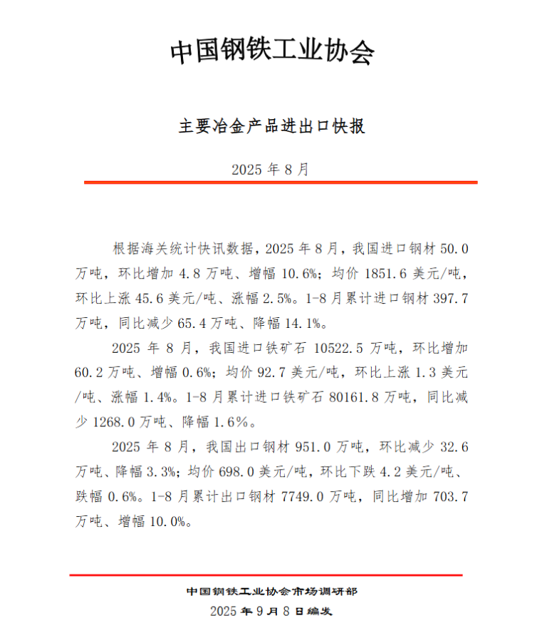 2025年8月主要冶金产品进出口快报