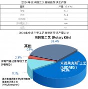 根据印度海绵铁制造商协会(SIMA)数据,印度继续稳居全球最大直接还原铁生产国地位,2024年产量达5470万吨,同比增长11.1%,其中回转窑直接还原铁产量继2023年增长12.8%、2022年增长17.8%、2021年增长18.7%后,于2024年同比再增13.9%。伊朗2024年直接还原铁产量达3410万吨,较2023年的3340万吨增长了2.1%,全部产量均源于天然气基工艺,其中米德莱克斯®(MIDREX®)工艺直接还原铁产量占比约90%。2024年伊朗有3座新工厂投产。俄罗斯以800万吨产量保持全球第三大直接还原铁生产国地位,全部采用天然气基工艺生产。沙特阿拉伯以650万吨产量维持在第4位。