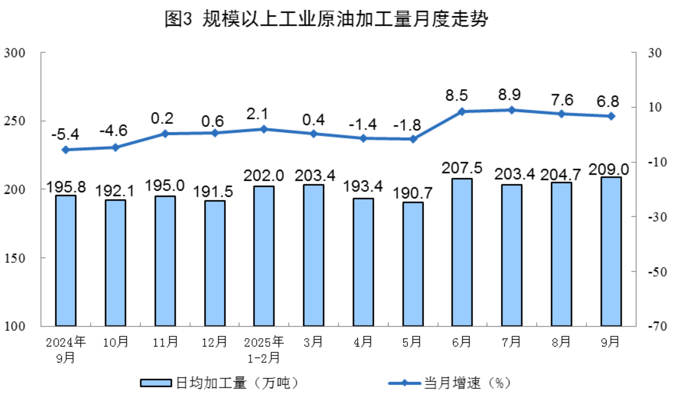 原油加工较快增长。9月份,规上工业原油加工量6269万吨,同比增长6.8%;日均加工209.0万吨。