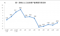 原煤生产保持稳定。11月份,规上工业原煤产量4.3亿吨,同比下降0.5%;日均产量1423万吨。