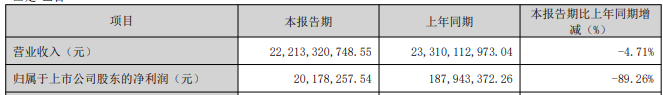 摘要:归属于上市公司股东的净利润为0.20亿元,同比下降89.26%。