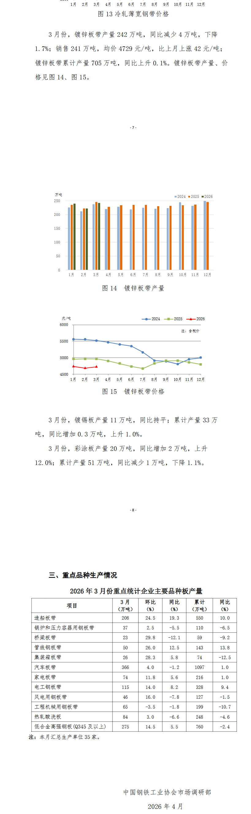 3月份,重点统计企业中厚板轧机、冷连轧机产量同比上升,热连轧机产量同比下降。主要品种板产量同比各有升降,其中造船板和管线钢板产量增幅较大,桥梁板降幅较大。产品价格方面,特厚板和镀锌板环比上升较多,冷轧板价格下降较多。