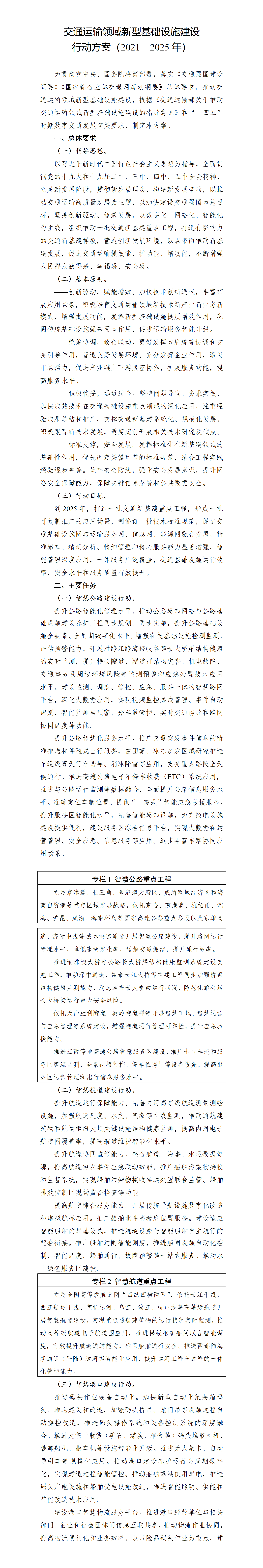 为加快建设交通强国,推动交通运输领域新型基础设施建设,现将《交通运输领域新型基础设施建设行动方案(2021—2025年)》印发给你们,请认真贯彻落实。