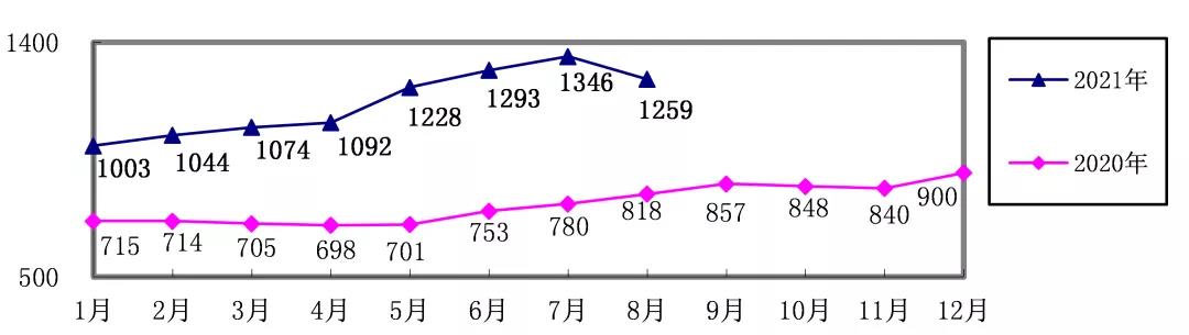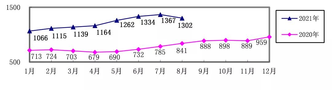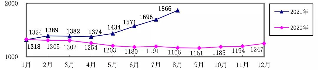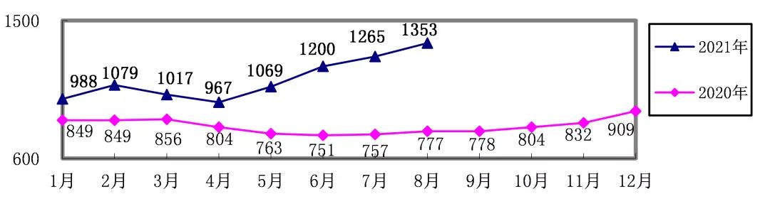 喷吹煤8月份加权平均折算成干基的采购成本为1353.36元/吨,环比升高88.60元/吨,升幅为7.00%。1-8月累计平均折算成干基的采购成本为1114.96元/吨,同比升高317.17元/吨,升幅为39.76%。