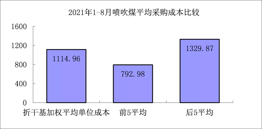 1-8月对标企业喷吹煤平均采购成本最低的前5家企业折算成干基的加权平均采购成本为792.98元/吨,比对标企业平均采购成本低321.98元/吨,低于平均采购成本28.88%;而采购成本最高的5家企业的加权平均采购成本为1329.87元/吨,比对标企业平均采购成本高214.92元/吨,高于平均采购成本19.28%。