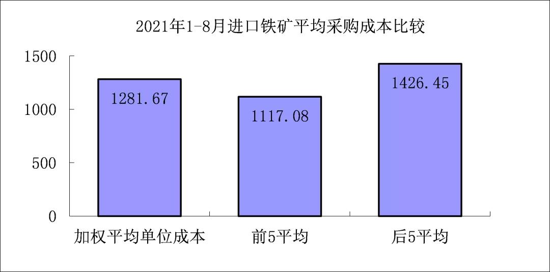 1-8月对标企业进口粉矿折算成62%品位的平均采购成本为1241.65元/吨,成本最低的前5家企业的加权平均采购成本为1111.19元/吨,比对标企业平均采购成本低130.46元/吨,低于平均采购成本10.51%;而采购成本最高的5家企业加权平均采购成本为1385.76元/吨,比对标企业平均采购成本高144.10元/吨,高于平均采购成本11.61%。
