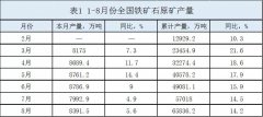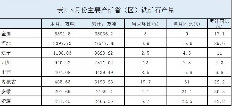 今年以来,我国铁矿石产量明显增长,月度产量始终保持较大幅度增长,累计产量始终保持两位数增长(见表1)。据国家统计局数据,8月份全国铁矿石原矿产量为8391.5万吨,同比增长5.6%;1-8月份累计产量达6.58亿吨,同比增长14.2%,年化产量将达到9.87亿吨,2018年以来首次接近10亿吨。