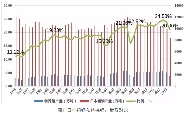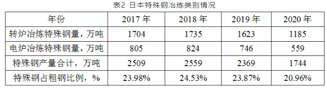 在日本粗钢总产量保持稳定情况下,随着经济发展其特殊钢产量不断增加,从1973年的1338万吨增长到了2018年最高值2559.4万吨,占粗钢比例也从1973年的11.22%增长到2018年的最高值24.53%。2020年受疫情影响,特殊钢产量降为1743.6万吨,占粗钢比例下降为20.96%(详见表2)。