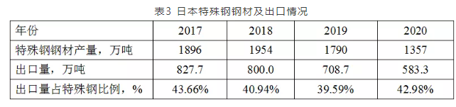 日本是一个特殊钢材出口大国,特殊钢钢材以高质量闻名世界,比如高精度模具钢,出口量不断增加,从1980年的160万吨增加到了2008年的590.9万吨,2017年出口量达到了827.7万吨,出口量占特殊钢钢材达到了44%。近两年日本特殊钢钢材有所下降,2019年日本特殊钢材出口量708.7万吨,占特殊钢材总产量39.59%,2020年受疫情影响特殊钢材出口量为583.3万吨,占特殊钢钢材总产量43%(详见表3)。