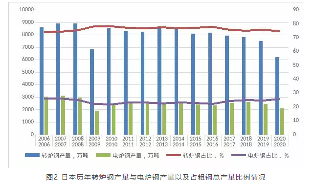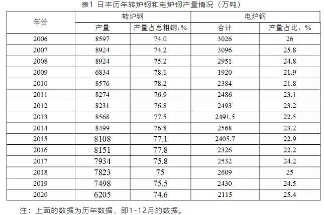 2020年日本转炉钢为6205万吨,同比大幅下降了17.2%,电炉钢产量为2115万吨,同比下降了13.0%,转炉钢和电炉钢产量占比分别为74.6%和25.4%(详见表1)。按钢种划分,2020年粗钢中普碳钢产量为6576万吨(同比减少13.0%),特殊钢产量为1744万吨(同比减少26.4%)。