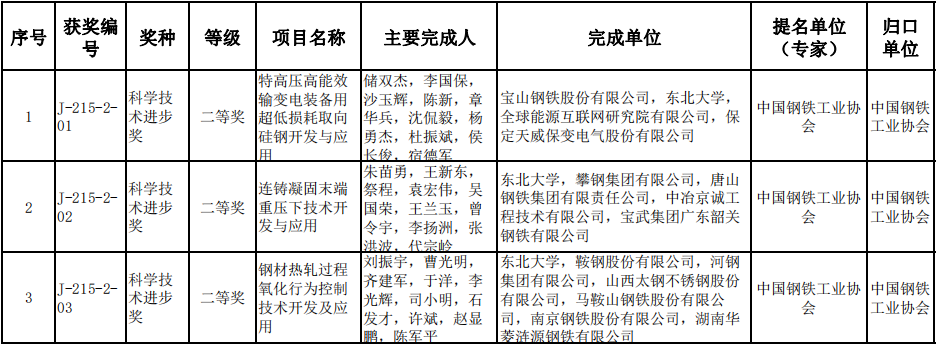 11月3日上午,2020年度国家科学技术奖励大会在北京人民大会堂召开。钢协提名的3项成果均荣获2020年度国家科学技术进步奖二等奖。分别为:宝钢牵头完成的“特高压高能效输变电装备用超低损耗取向硅钢开发与应用”、东大牵头完成的“连铸凝固末端重压下技术开发与应用”和“钢材热轧过程氧化行为控制技术开发及应用”。