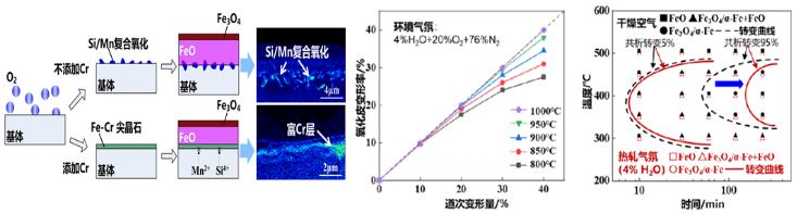 图1 合金元素选择性氧化的交互作用、氧化皮的热变形行为及FeO相变行为