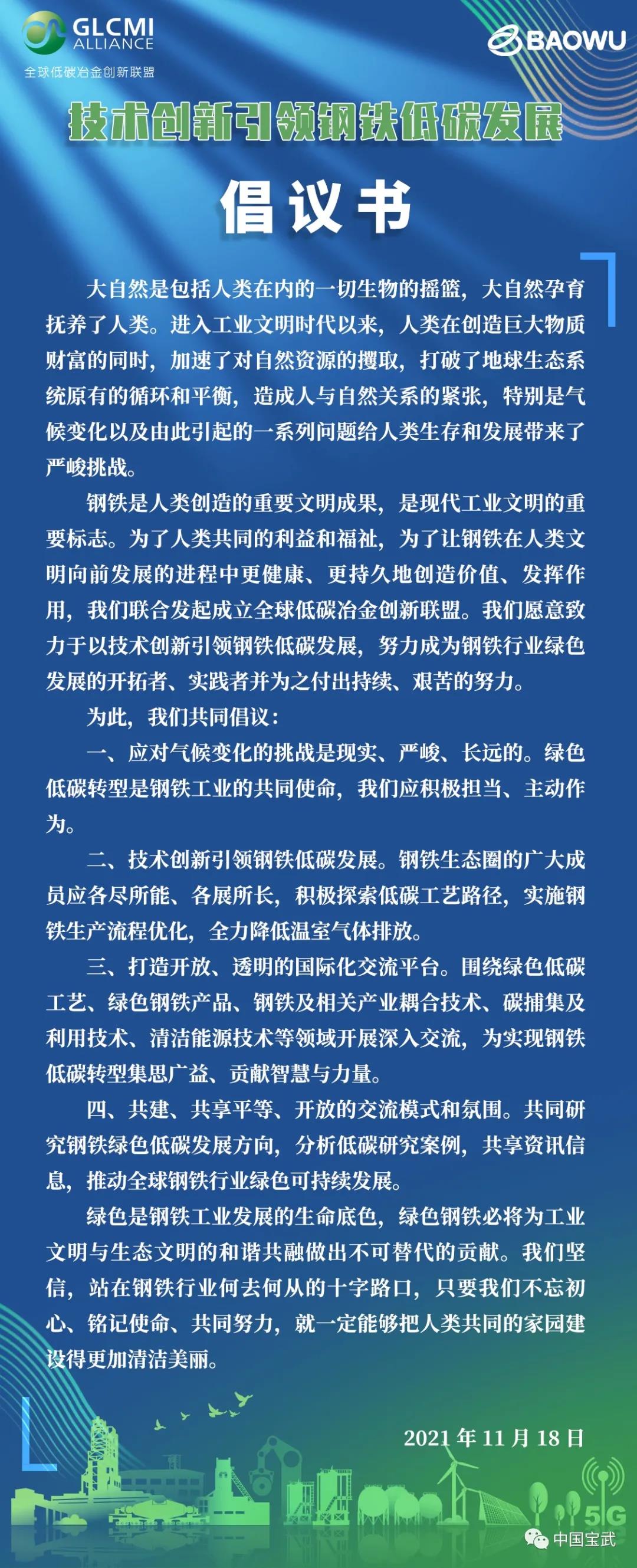 中国宝武钢铁会博中心“金色炉台”,在冬日暖阳的浸染下流光溢彩、绿意融融。在这个沉淀了中国钢铁制造传统文化,见证了上海钢企转型发展历程的地方,又迎来了钢铁工业绿色低碳发展历程中的重要时刻,11月18日,由中国宝武倡议并联合全球钢铁业及生态圈伙伴单位共同发起的全球低碳冶金创新联盟在这里宣布成立。来自15个国家的企业家、专家、学者集聚一堂,共商应对低碳挑战之策,共谋开创绿色未来之路。中国宝武将携手全球钢铁同行和上下游合作伙伴,共同推动钢铁工业绿色低碳转型和高质量发展。