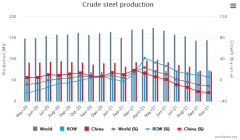 2021年10月,中国粗钢产量为7160万吨,比2020年10月下降23.3%。印度粗钢产量为980万吨,增长2.4%。日本粗钢产量820万吨,增长14.3%。美国粗钢产量750万吨,增长20.5%。据估计,俄罗斯的粗钢产量为610万吨,下降了0.5%。韩国粗钢产量为580万吨,下降1.0%。德国粗钢产量370万吨,增长7.0%。土耳其粗钢产量350万吨,增长8.0%。巴西估计粗钢产量为320万吨,增长10.4%。伊朗估计粗钢产量为220万吨,下降15.3%。