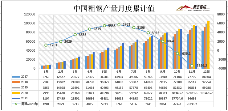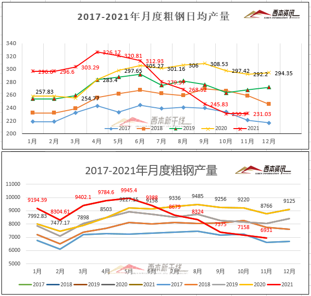 据国家统计局统计,11月份我国粗钢、生铁和钢材产量分别为6931万吨、6173万吨和10103万吨,同比分别下降22%、下降16.6%和下降14.7%;日均产量分别为231.03万吨、205.77万吨和336.77万吨,日均环比分别增长0.1%、增长1.2%和增长2.6%。
