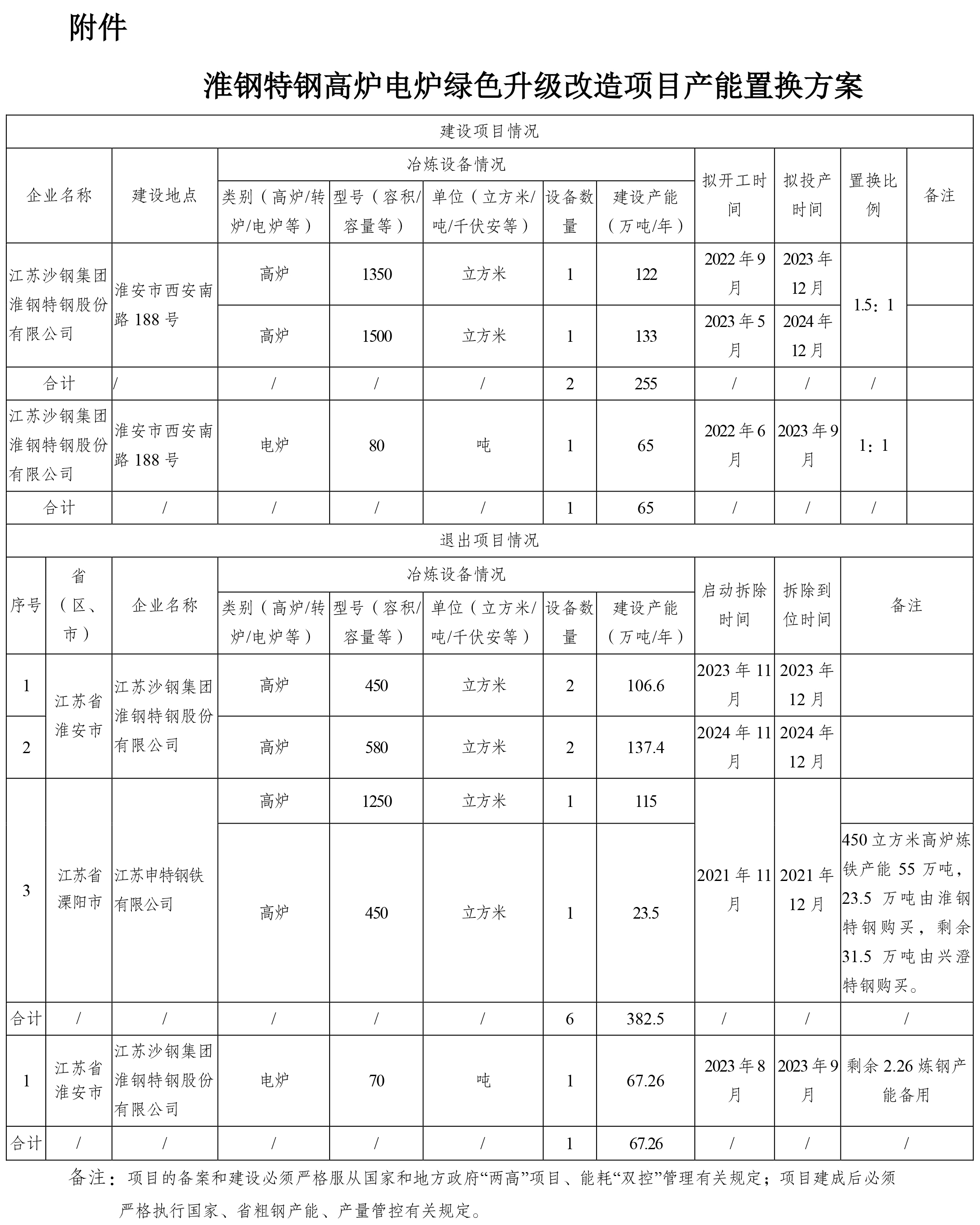 按照《国务院关于化解产能严重过剩矛盾的指导意见》、《国务院关于钢铁行业化解过剩产能实现脱困发展的意见》和《钢铁行业产能置换实施办法》要求,我厅自2021年12月3日至2021年12月22日对江苏沙钢集团淮钢特钢股份有限公司(以下简称淮钢特钢)高炉电炉绿色升级改造项目产能置换方案进行了公示,公示期间未收到异议。现予公告,欢迎社会公众进行监督。联系电话:025-69652731(业务咨询)、025-69652843(信访举报)。