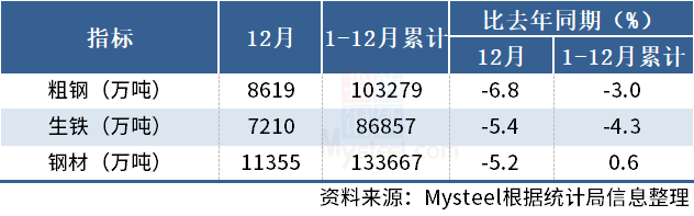 1-12月份,中国粗钢产量103279万吨,同比下降3.0%;生铁产量86857万吨,同比下降4.3%;钢材产量133667万吨,同比增长0.6%。