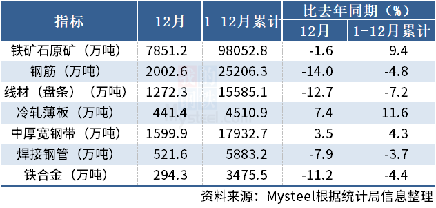 12月份,中国铁矿石原矿产量为7851.2万吨,同比下降1.6%;1-12月累计产量为98052.8万吨,同比增长9.4%。