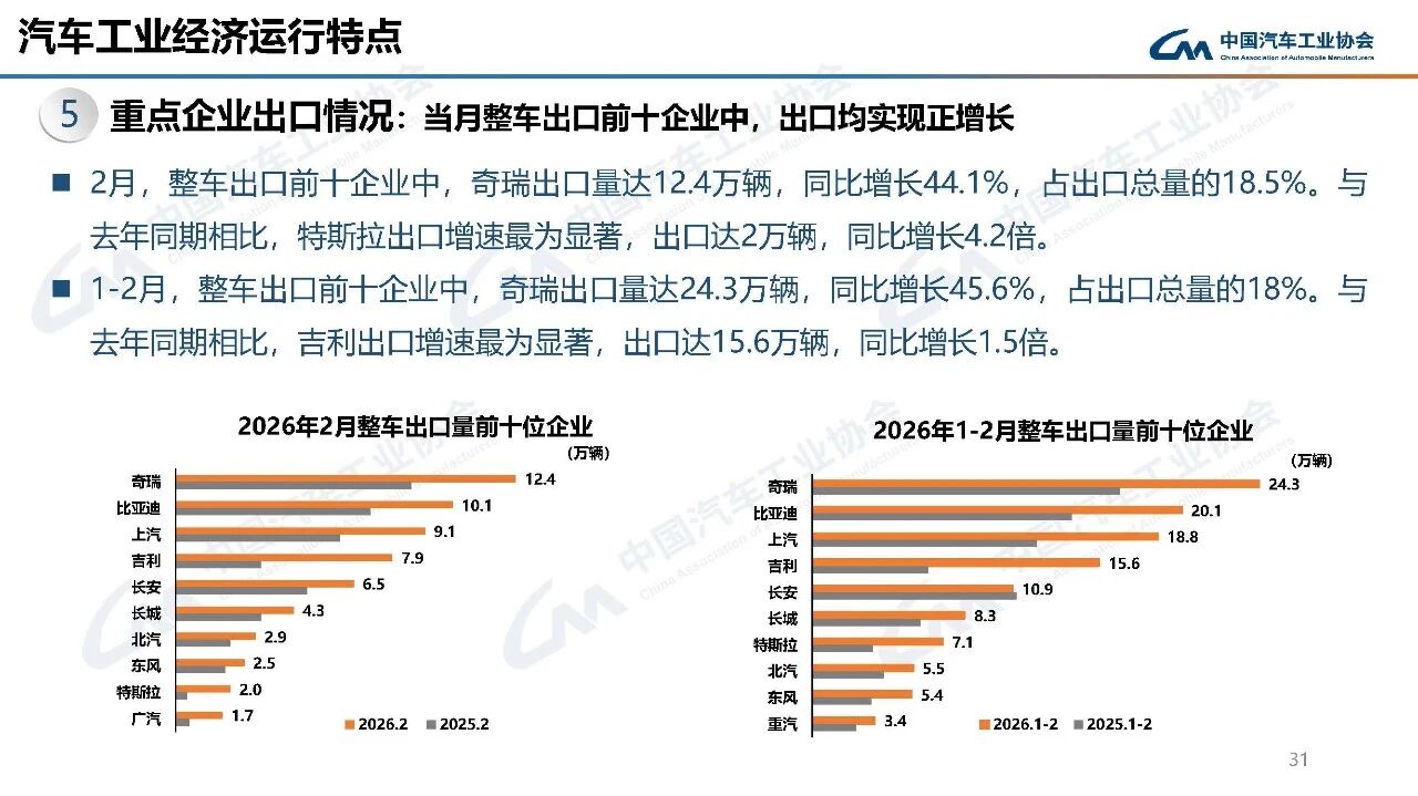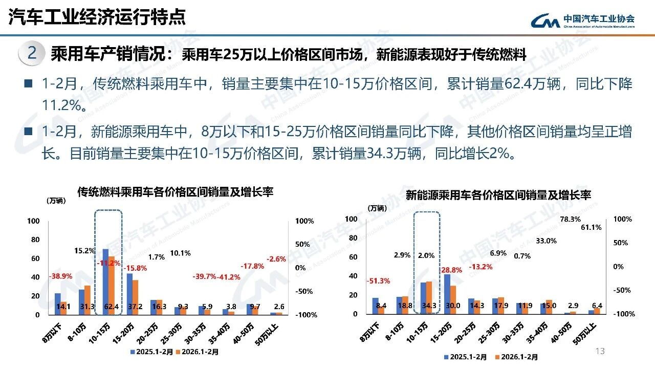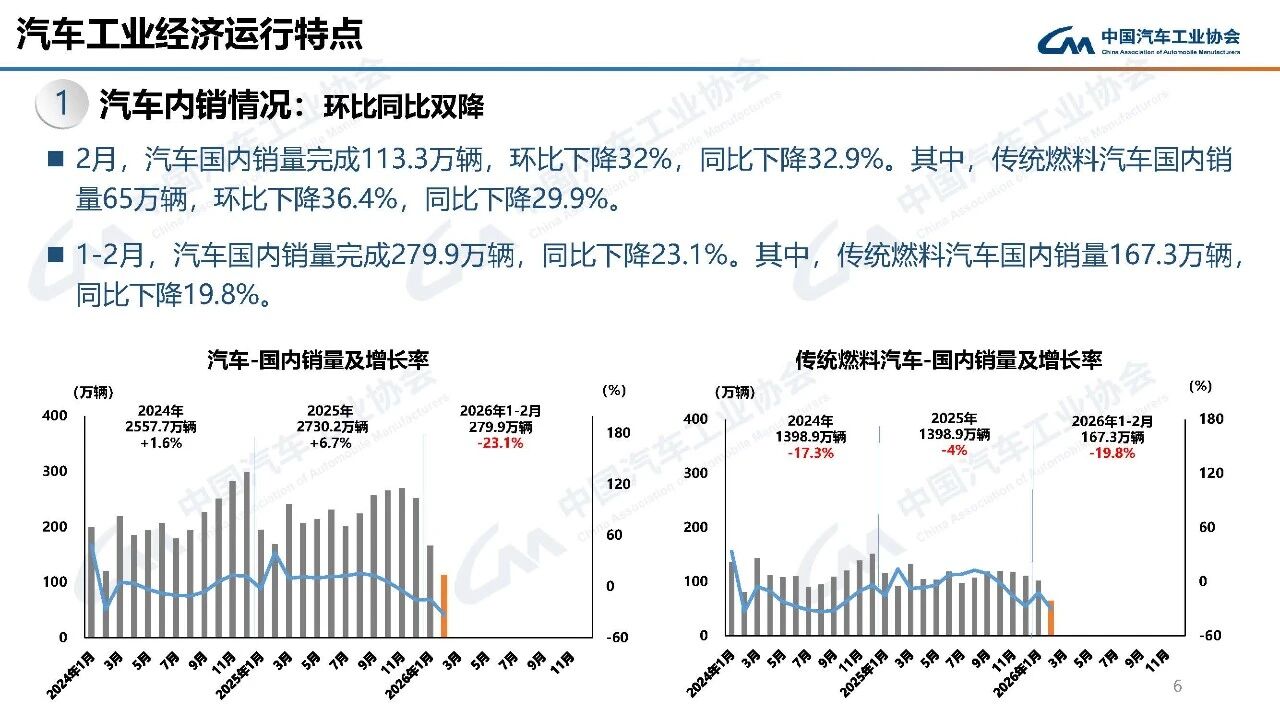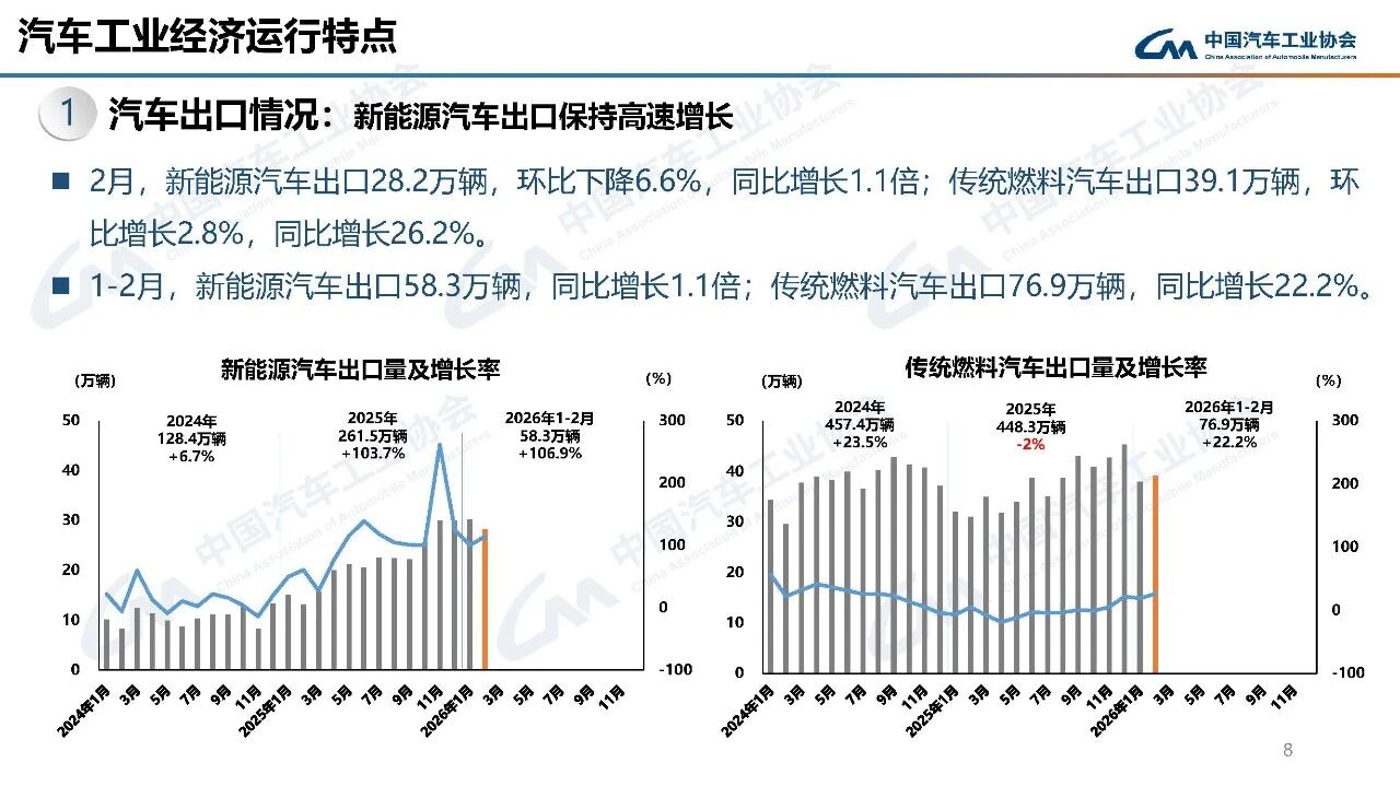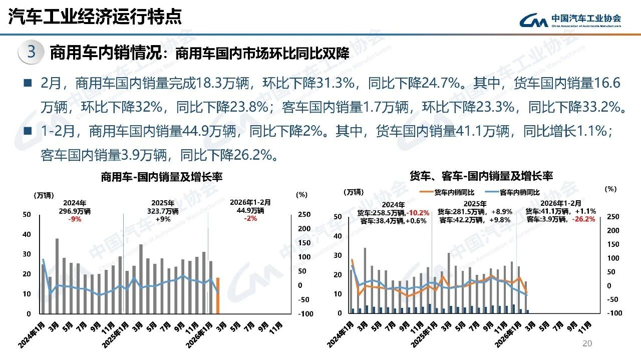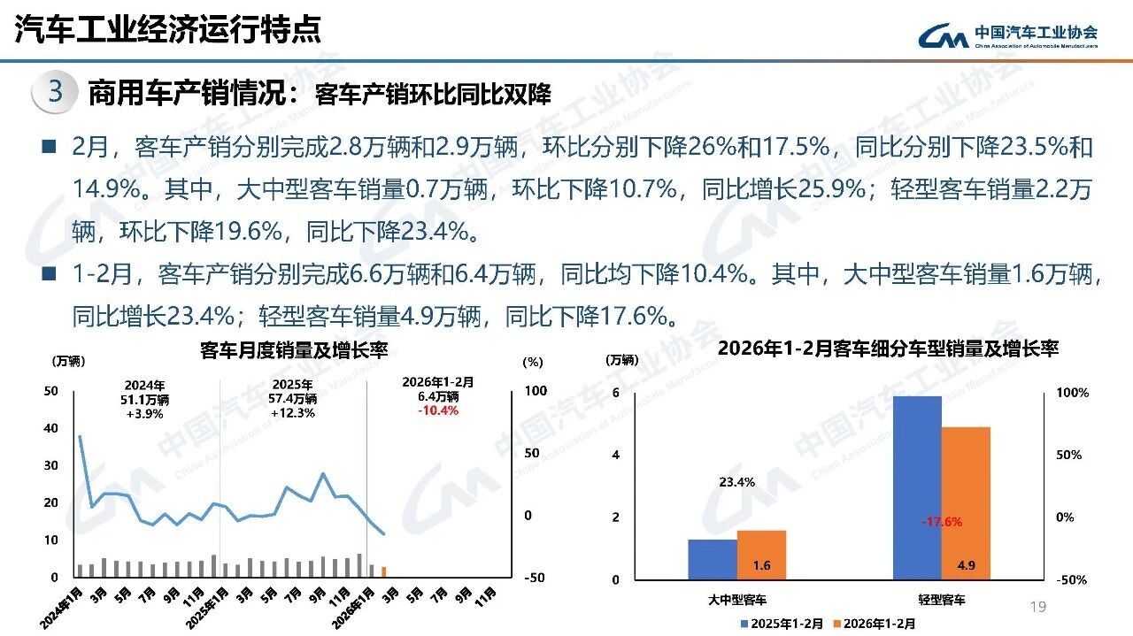 据中国汽车工业协会分析,今年春节在2月中下旬,且假期有所延长,2月有效工作日仅16天,企业生产经营受到一定影响,市场活跃度总体有所下降。从1-2月行业运行情况看,汽车产销受政策切换调整、需求前置释放、春节假期错位、消费意愿不足、同期高基数等多重因素叠加影响,同比呈现下滑。其中,乘用车市场和新能源汽车同比下降,商用车市场持续向好,汽车出口快速增长。