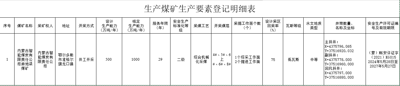 内蒙古智能煤炭有限责任公司麻地梁煤矿为产能核增煤矿,核定生产能力1000万吨/年,该矿已完成化解过剩产能任务并取得1000万吨/年环境影响报告书批复。按照《国家能源局关于完善煤矿产能登记公告制度开展建设煤矿产能公告工作的通知》(国能发煤炭〔2017〕17号)、《生态环境部国家发展改革委国家能源局关于进一步加强煤炭资源开发环境影响评价管理的通知》(环环评〔2020〕63号)等文件要求,现对该矿生产能力等相关要素信息予以公告。