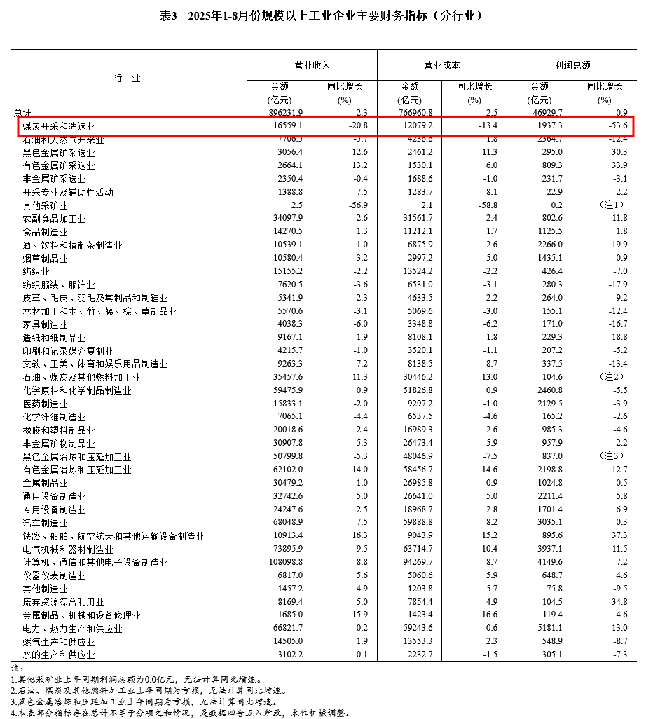 1—8月份,煤炭开采和洗选业利润总额1937.3亿元,同比下降53.6%。