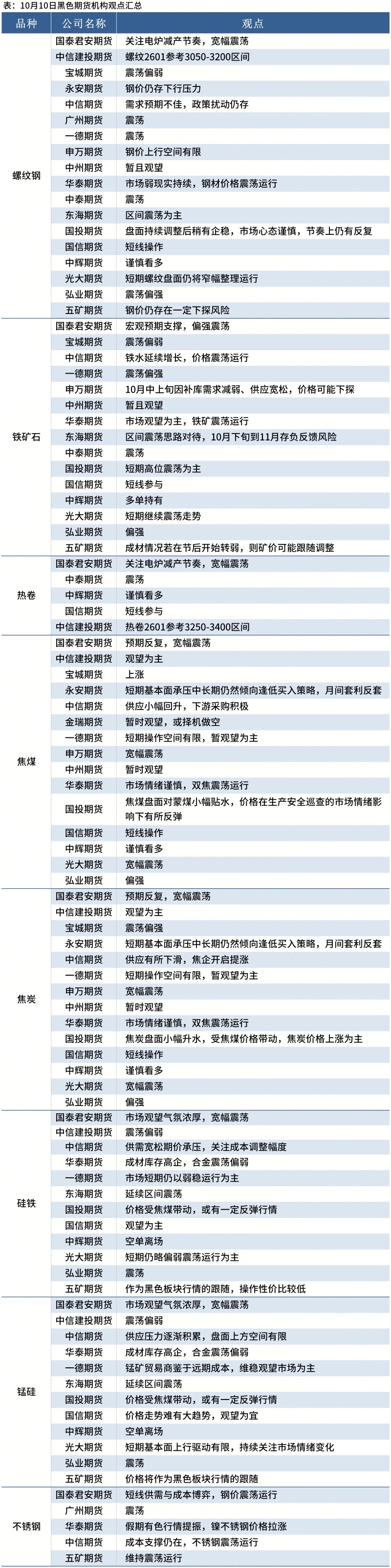 据Mysteel统计10月10日18家期货机构操作策略,其中多数机构料螺纹钢震荡运行,铁矿石震荡运行。具体汇总内容如下: