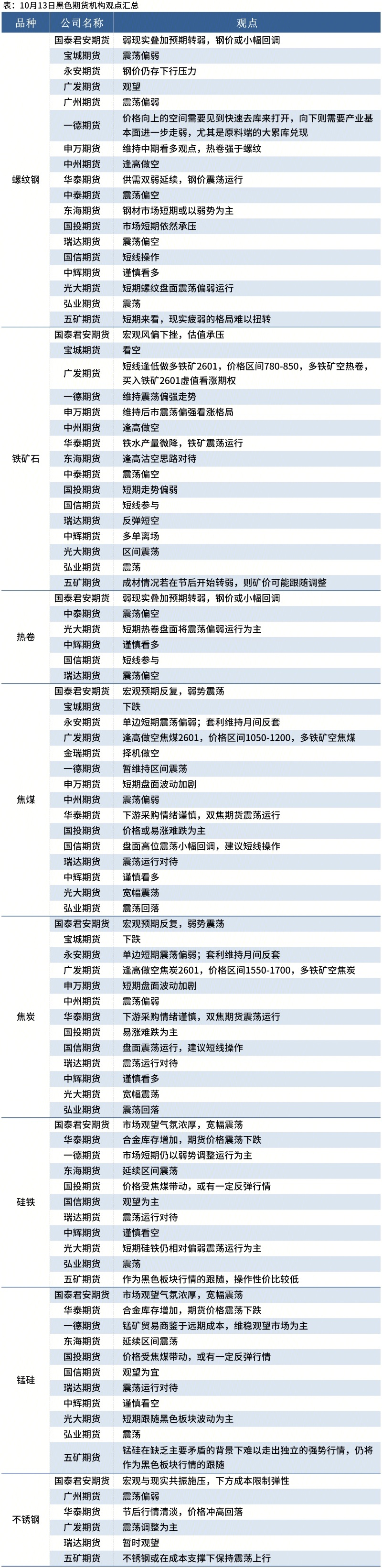 据Mysteel统计10月13日18家期货机构操作策略,其中多数机构料螺纹钢震荡偏弱,铁矿石震荡运行。具体汇总内容如下: