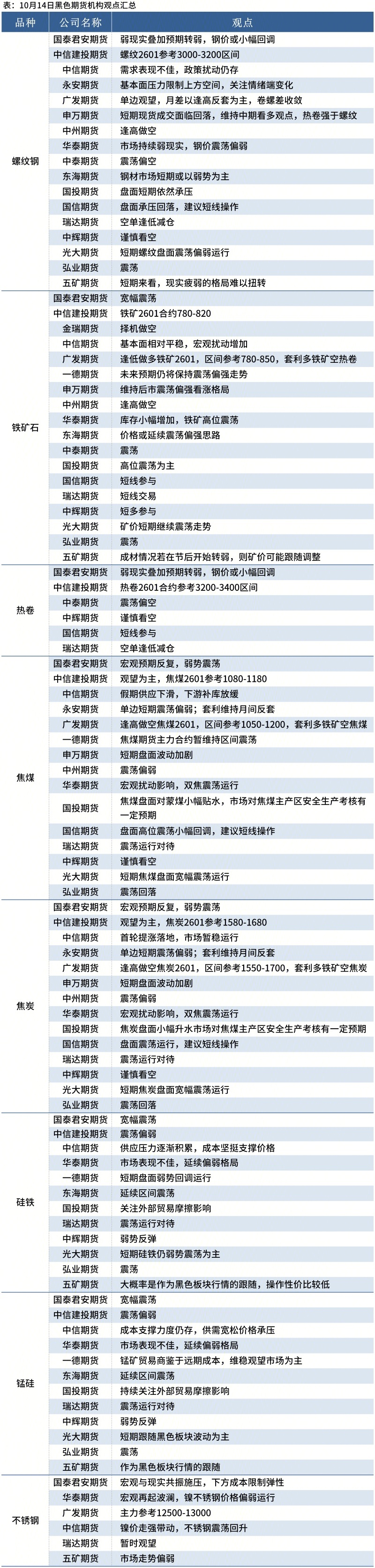 据Mysteel统计10月14日19家期货机构操作策略,其中多数机构料螺纹钢震荡偏弱,铁矿石震荡运行。具体汇总内容如下: