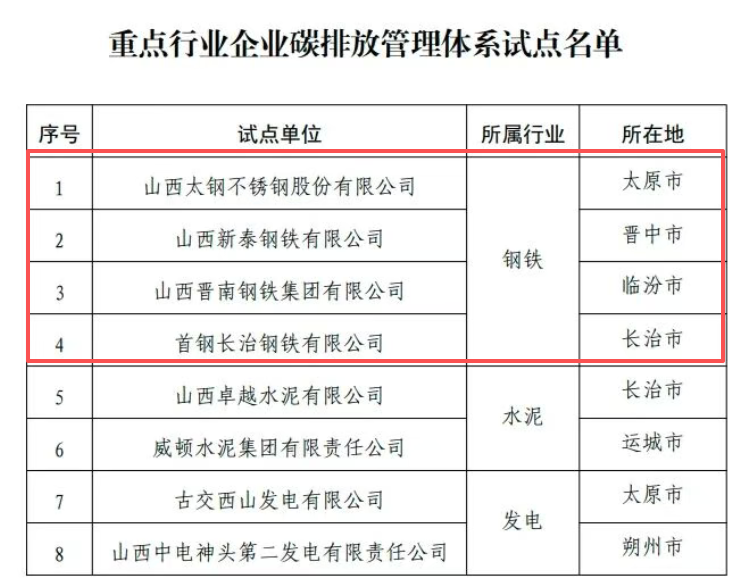 日前,山西省生态环境厅公布重点行业企业碳排放管理体系试点名单,此次共有8家单位进入试点名单。