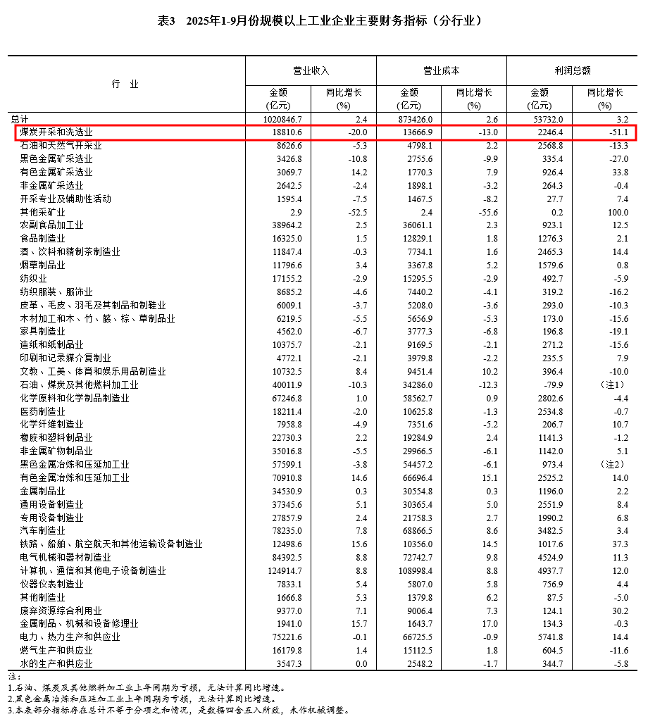 1—9月份,煤炭开采和洗选业利润总额2246.4亿元,同比下降51.1%。