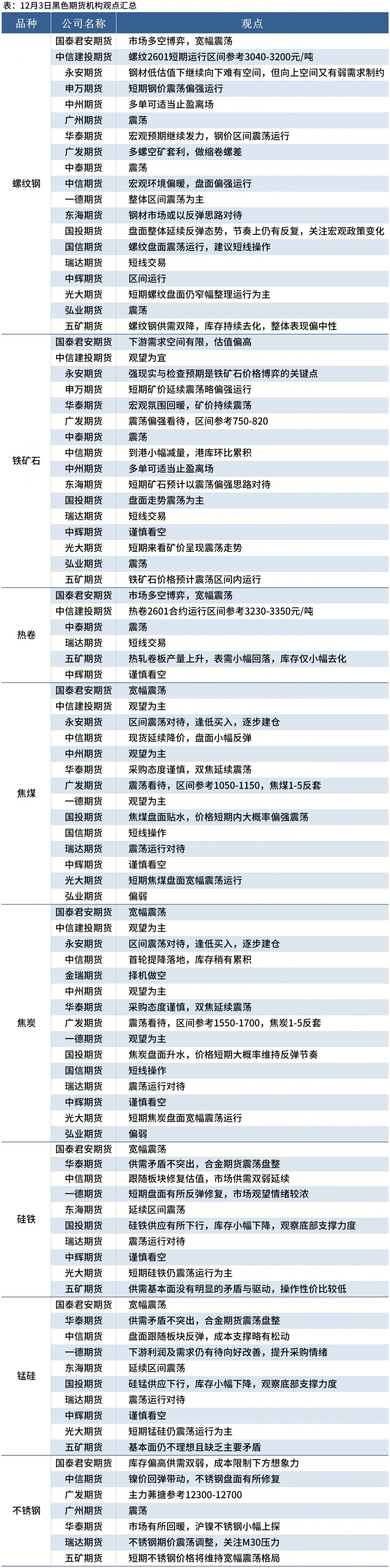 据Mysteel统计12月3日20家期货机构操作策略,其中多数机构料螺纹钢震荡运行,铁矿石震荡运行。具体汇总内容如下: