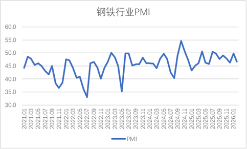从中物联钢铁物流专业委员会调查、发布的钢铁行业 PMI 来看,2026年2月份为46.7%,环比下降3.2百分点,显示钢铁行业受春节假期因素影响,运行短期有所趋缓。分项指数变化显示,钢铁供需两端均有所收缩,产成品库存有所下降,原材料和钢材价格均弱势运行。预计3月份,随着春节影响减退以及各地政策落实,钢铁行业将稳步回升,钢铁需求逐步复苏,带动钢厂生产协同上升,原材料和产成品价格端有所上升。