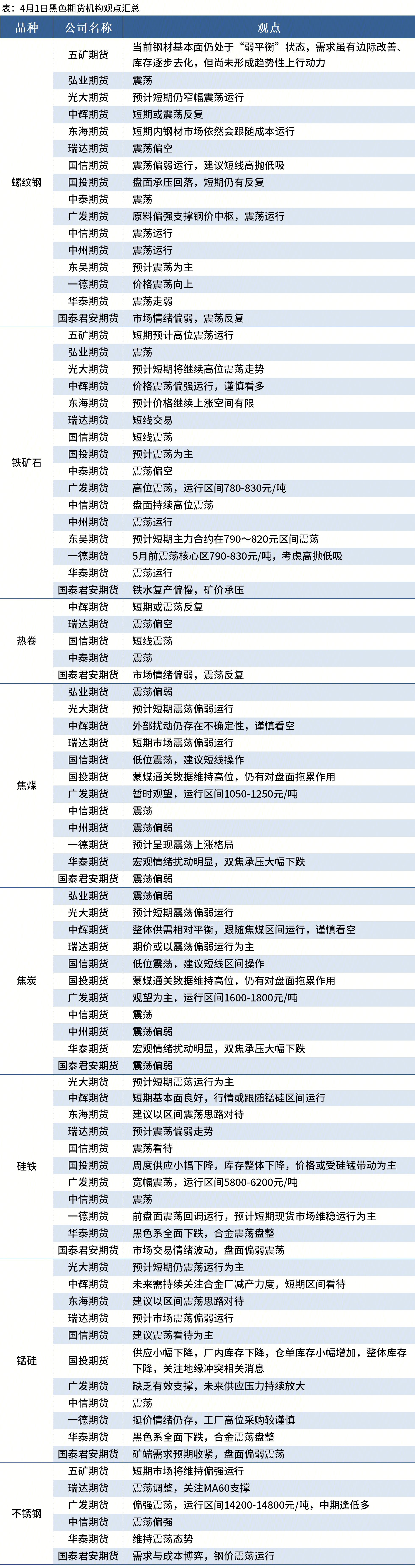 据Mysteel统计4月1日16家期货机构操作策略,其中多数机构料螺纹钢震荡运行,铁矿石震荡运行。具体汇总内容如下: