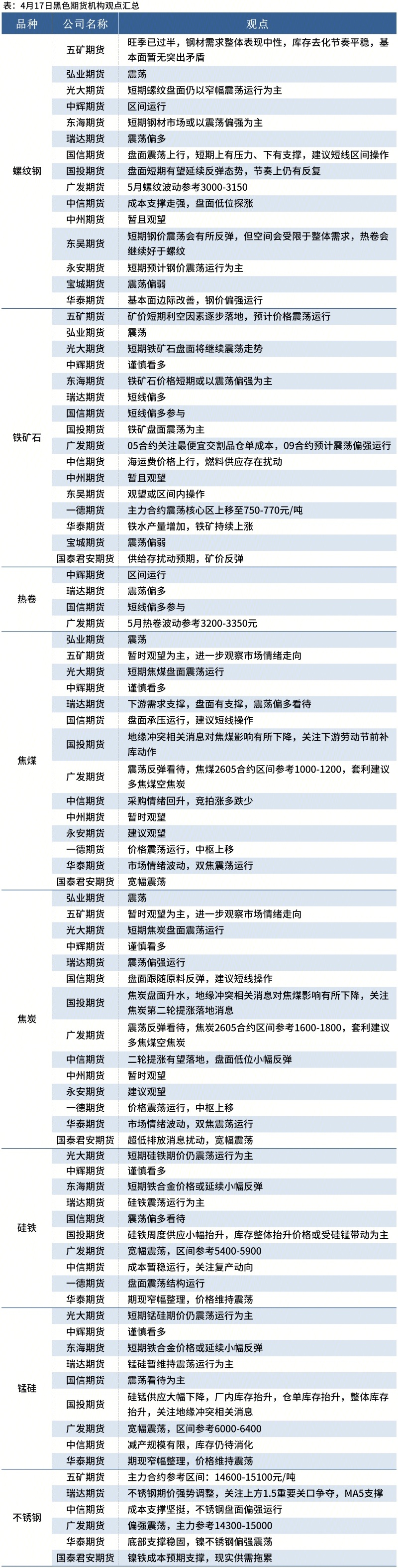 据Mysteel统计4月17日17家期货机构操作策略,其中多数机构料螺纹钢震荡运行,铁矿石震荡运行。具体汇总内容如下: