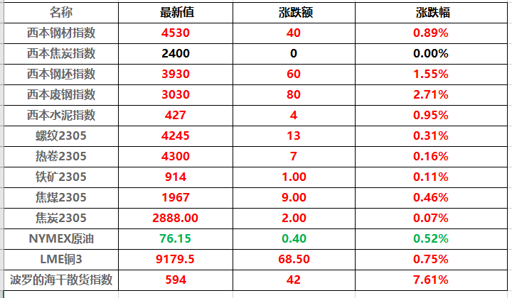 燃油涨近2%,纯碱涨超1%,白糖、PTA、甲醇、短纤涨近1%;跌幅方面,沥青、橡胶跌近1%。国际铜夜盘收涨1.04%,沪铜收涨0.95%,沪铝收跌0.24%,沪锌收涨0.04%,沪铅收涨0.23%,沪镍收涨2.01%,沪锡收涨3.13%。不锈钢夜盘收涨1.28%。上期所原油期货2304合约夜盘收跌1.34%,报546.30元人民币/桶。沪金夜盘收跌0.08%,沪银收涨0.52%。