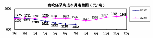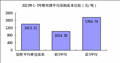 喷吹煤7月份加权平均折算成干基的采购成本为1102.14元/吨,环比下降26.25元/吨,降幅为2.33%。1—7月累计平均折算成干基的采购成本为1413.11元/吨,同比下降248.44元/吨,降幅为14.95%。