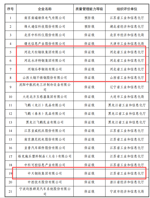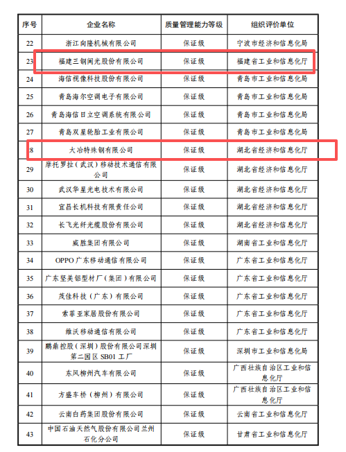 为落实《制造业卓越质量工程实施意见》(工信部联科〔2023〕249号)和《工业和信息化部办公厅关于开展2024年制造业企业质量管理能力评价工作的通知》(工信厅科函〔2024〕160号),经自评价、评价复核、二次复核、征求意见、社会公示,我部确定了首批43家质量管理能力高等级企业名单,现予以公布。