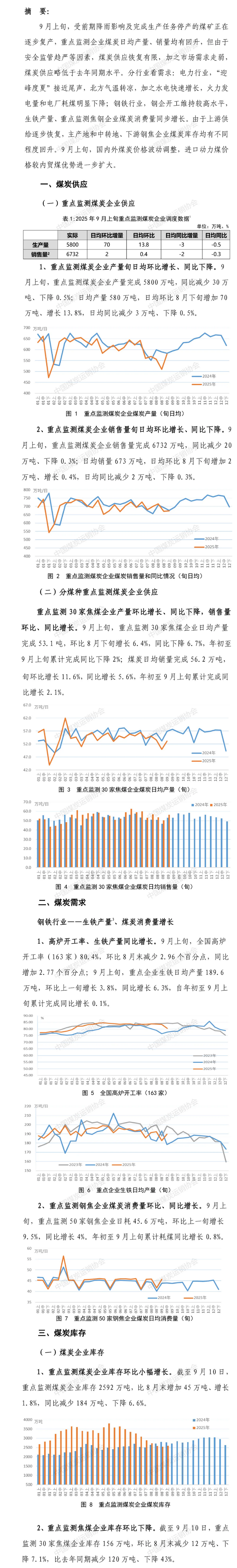 中国煤炭运销协会数据显示,9月上旬,重点监测煤炭企业产量完成5800万吨,同比减少30万吨、下降0.5%;日均产量580万吨,日均环比8月下旬增加70万吨、增长13.8%,日均同比减少3万吨、下降0.5%。