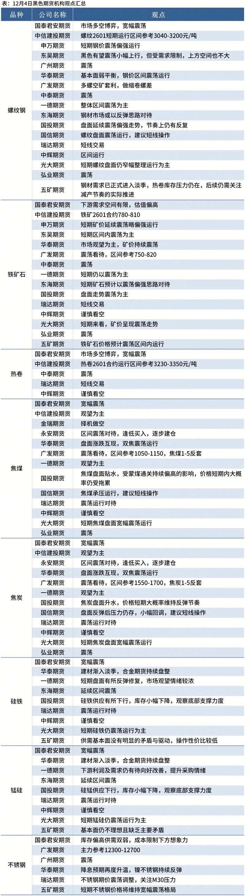 据Mysteel统计12月4日19家期货机构操作策略,其中多数机构料螺纹钢震荡运行,铁矿石震荡运行。具体汇总内容如下:
