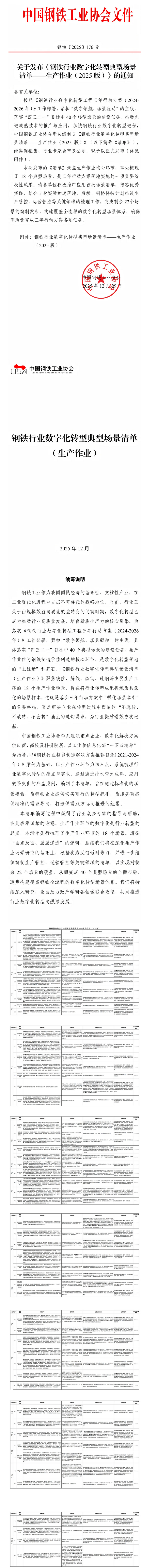 中钢协发布《钢铁行业数字化转型典型场景清单——生产作业(2025版)》的通知。