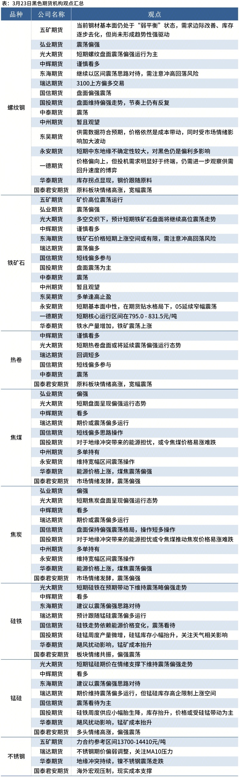 据Mysteel统计3月23日15家期货机构操作策略,其中多数机构料螺纹钢震荡偏强,铁矿石震荡偏强。具体汇总内容如下: