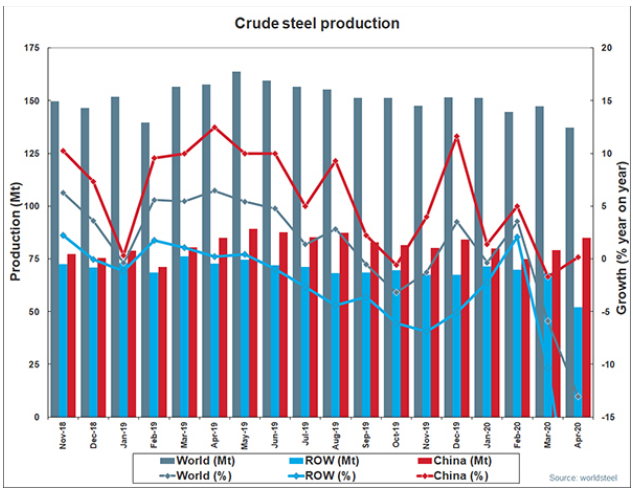 新干线讯:据世界钢铁协会统计,2020年4月全球64个纳入世界钢铁协会统计国家的粗钢产量为1.371亿吨,同比下降13%。其中:2020年4月中国粗钢产量为8500万吨,同比提高0.2%;印度4月的粗钢产量为310万吨,同比下降65.2%;日本4月的粗钢产量为660万吨,同比下降23.5%。4月,欧盟地区4月粗钢产量预估为1072.9亿吨,同比下降22.9%。